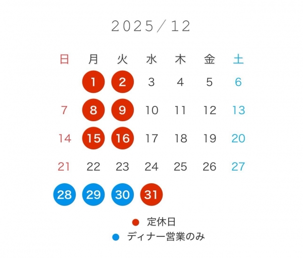 RISTORANTE IL PRESIDENTE 12月のお休みのお知らせです